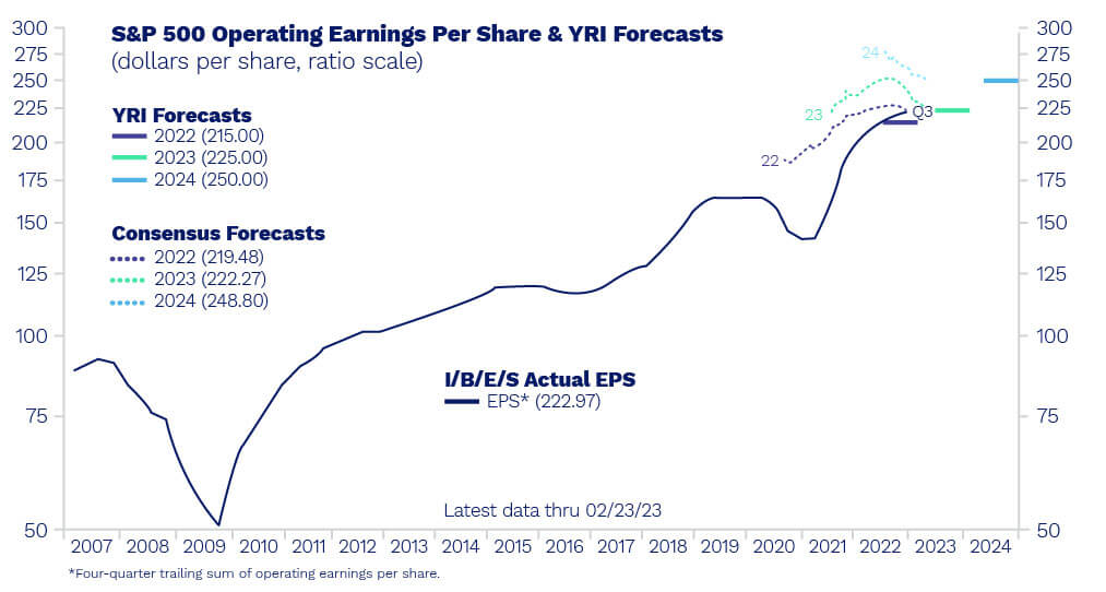 If you were to place a typical price-to-earnings (P/E) multiple of 15 on that, then it’s conceivable that there’s room to the downside toward 3000 on the S&P 500. Bulls counter by saying we have not seen a material drop in earnings yet and that using a recession-level P/E ratio and earnings figure is extreme. Moreover, if 2024 earnings indeed arrive in the $240 to $250 range (current consensus is $250) while using a recovery-level P/E of 18, then there’s a case to be made that equities should recover into the mid-4000s before long.