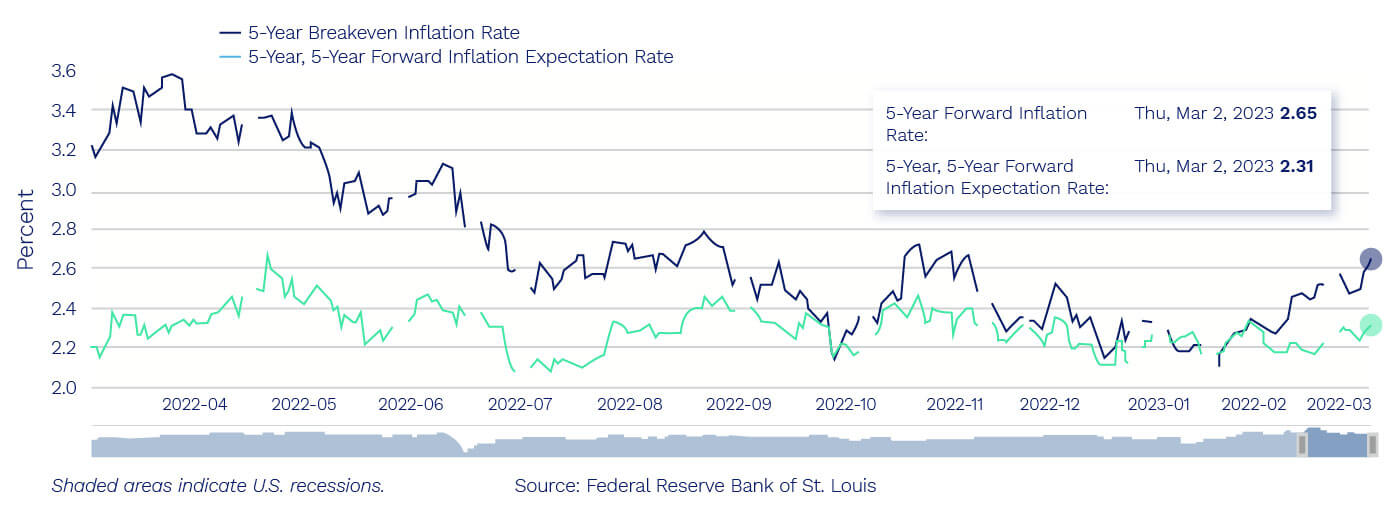 Corporate earnings are not the only source of uncertainty that could warrant a higher VIX this year. Another variable that causes ire at the Fed is of course inflation. There’s some good news here, but also a highly uncertain outlook. While the 12-month look back on the CPI rate remains alarming—up 6.4% from January 2022 through January 2023—forward indicators suggest a return to near-normal inflation is in the cards, but they are also well off the lows seen earlier in the year.