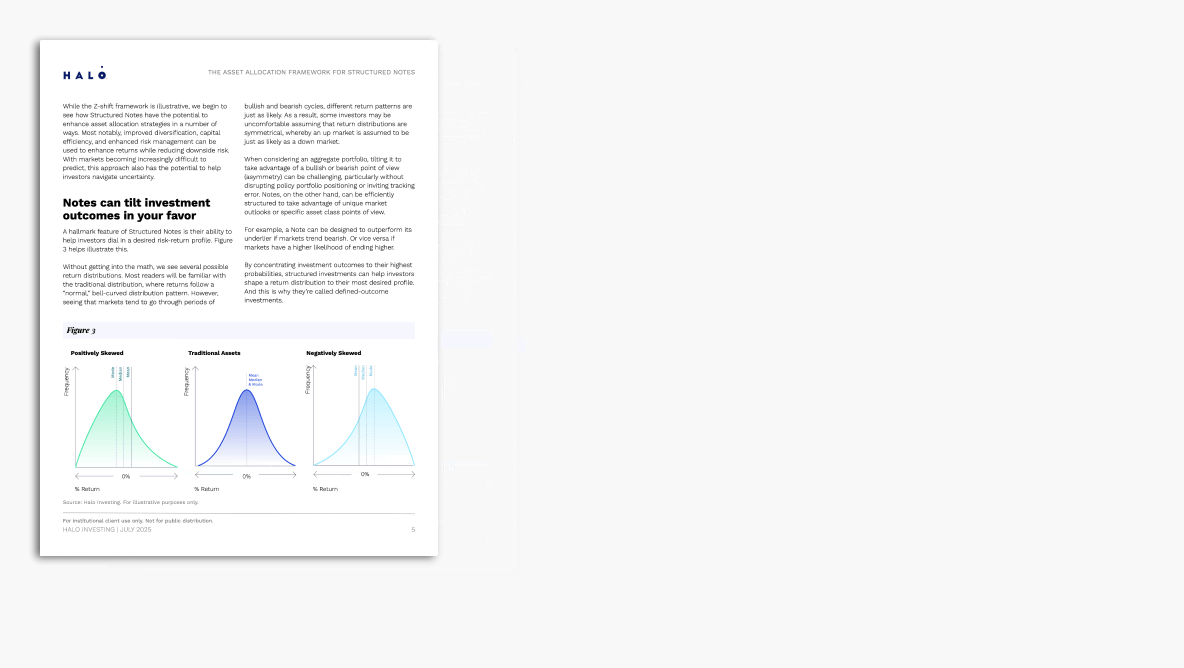 Aura is the first simulation tool built specifically to model the role of Structured Notes in portfolio construction. Integrated directly into the Halo platform, Aura helps advisors quantify Structured Note allocations, visualize their potential impact, and clearly communicate investment strategies to clients.