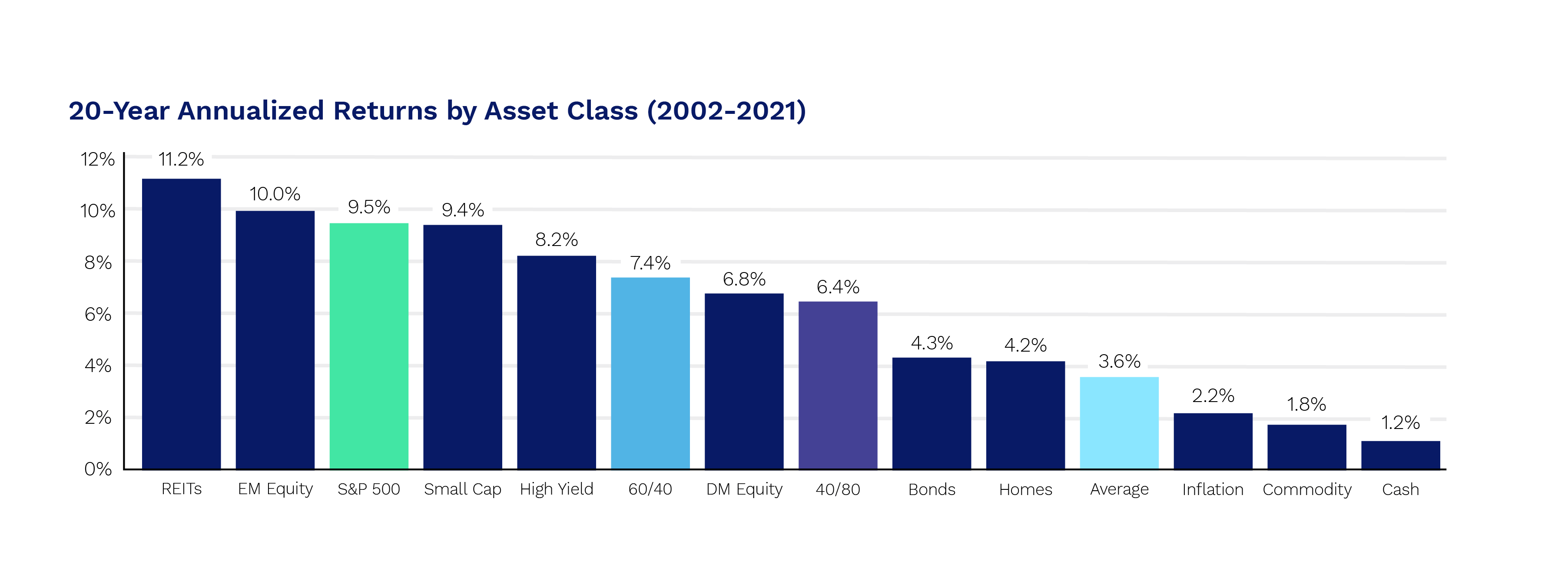 Among the favorite charts of financial advisors is one from J.P. Morgan Asset Management that illustrates the importance of staying invested when volatility arises. It’s commonly known that market timing is like a land mine on the road to retirement. According to historical data, over the previous two decades, the S&P 500 has returned 9.4% on average each year. That is a solid return. If you tried to swoop in and out and missed the 10 best days, however, your net return would have been just 5.21%. Missing the 20 best days would have left you with a return that barely beat inflation.