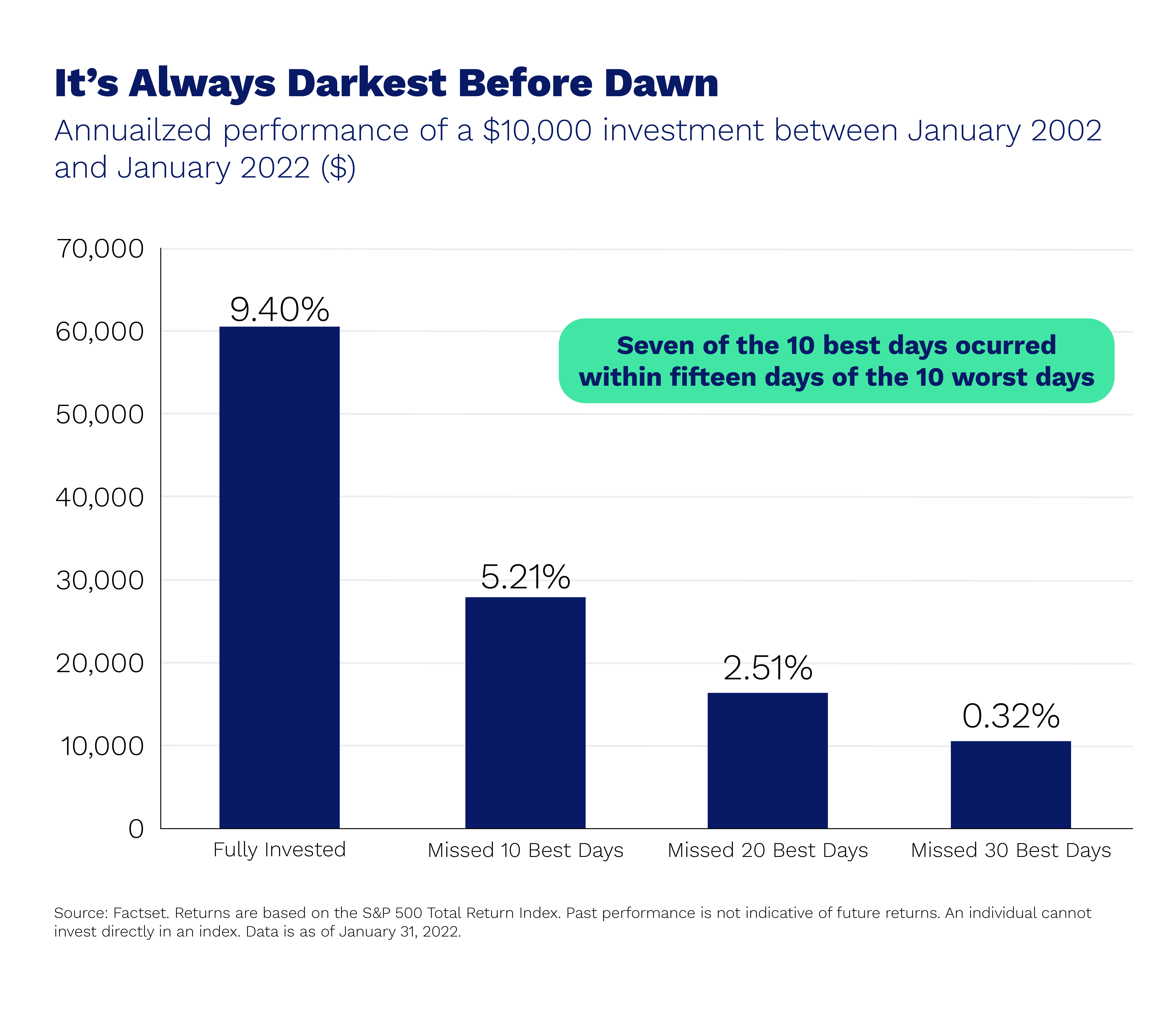 - Volatility causes bad investor behavior such as trying to time the market.